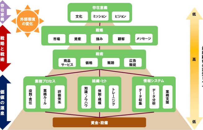 「価値の源泉」である「業務プロセス」「組織・ヒト」「情報システム」は、会社の戦略と戦術を支える社内の共有基盤であり、商品やサービスを通して、自社の顧客に対して価値を提供するための土台である。これらの要素は、通常、顧客には見えにくいが、企業の努力と工夫により大きく差が出る部分だと考えている。また、「価値の源泉」の根幹を成すのは人間であることを忘れてはいけない。